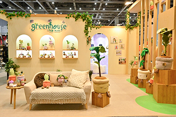 暖かいお家をイメージ。照明や什器、ソファーなどの色や配置にもこだわり、家の中に癒しをもたらす、植物をモチーフにしたぬいぐるみ「Greenhouse」が身近にある空間を表現した。 |