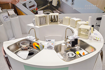 まずサイネージで興味を引きつけ、次に前面中央のキッチン・シンクのディスプレイで「UKIUKI」がある生活とない生活の違いを表現。さらに回遊して個別商品を見てもらうことを意識。 |