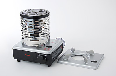 カセットボンベ1本で調理と暖房ができる「こんろ&ストーブ」。4つの安全装置を搭載した安心設計。 |