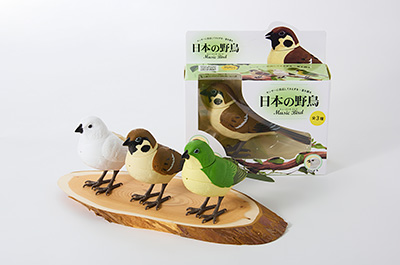 センサーに反応して首を振りくちばしを動かしながらさえずります。鳴き声6種類と童謡6曲を収録。 |