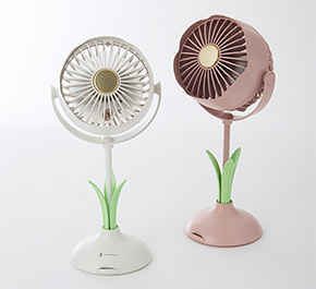 フラワーモチーフがかわいいデスクファン、便利なスマホスタンド・LEDライト搭載でアロマオイルも対応 |