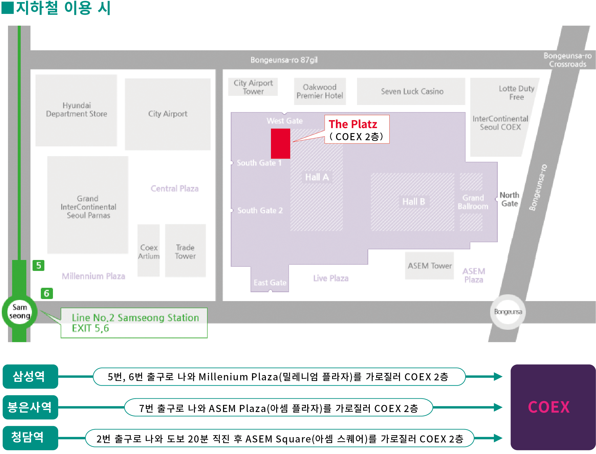 지하철 : 2 호선 삼성역 5 번 , 6 번 출구 / 9 호선 봉은사역 7 번 출구 / 7 호선 청담역 2 번 출구