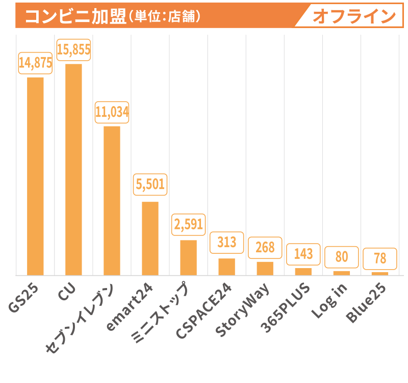 - ● ロッテハイマート(家電量販店)、 電子ランド(家電量販店)、サムスンデジタルプラザ(家電量販店)、LG電子ベストショップ(家電量販店)など