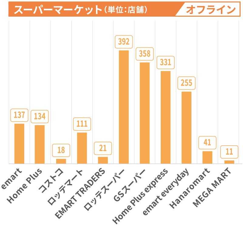 - ● emart(大型スーパー)、 HomePlus(大型スーパー)、 ロッテマート(大型スーパー)、オアシス(オーガニック系スーパー)、MONOMART(日本食材スーパー)など