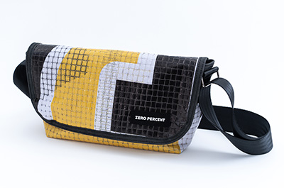 バナー、コルク、シートベルトを再利用したアップサイクルバッグです。 |