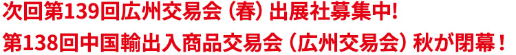 | 次回の第139回広州交易会は、4月15日から3期にわたり開催される予定です。 | ||||