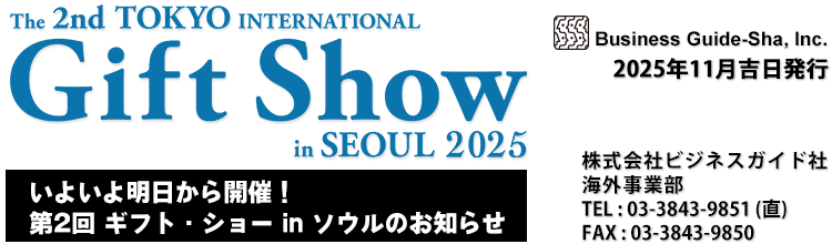| 【お問合せ先】株式会社ビジネスガイド社 海外事業部 〒111-0034 東京都台東区雷門2-6-2 ぎふとビル TEL: +81(0)3-3843-9851(直) / FAX: +81(0)3-3843-9850 E-mail: seoul@giftshow.co.jp |