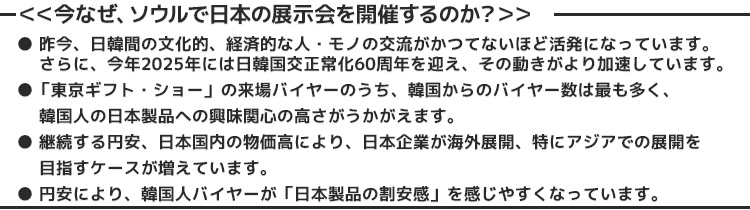 | 1.日本企業29社が出展 伝統工芸品、日用品、キャラクターグッズなど、多様な日本製品を展示します。 2.日本市場の最新トレンドを発信 日本国内で注目されている商品が韓国で初めてお披露目されます。 また日本市場に精通した専門家によるセミナーが開催され、日本とのビジネスのきっかけとなる機会を豊富にご用意しています。 3.ビジネスマッチングのチャンス 日本企業の担当者と直接出会い、仕入れの商談や、新たなビジネス創出の場をご提供いたします。 |
